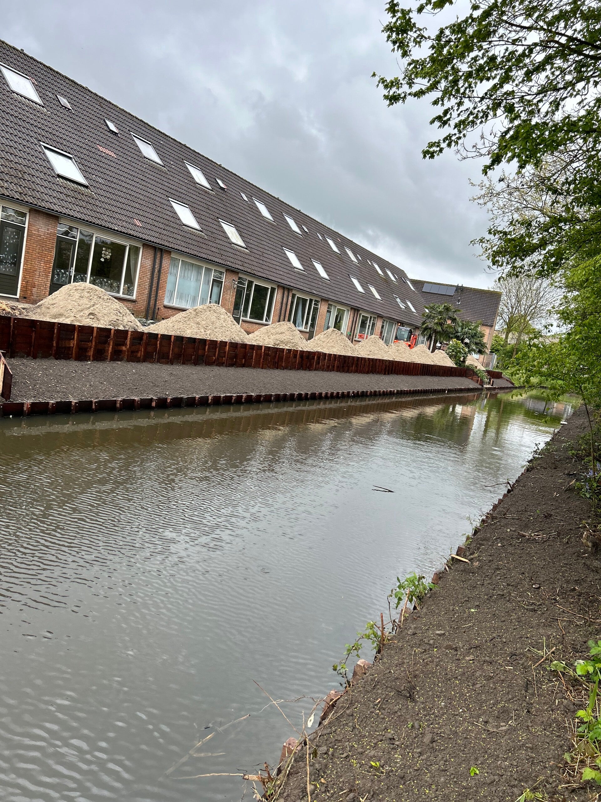hier heb ik voor de opdracht gever samen met werknemers van de opdracht gever. de beschoeiing in de watergang vervangen voor een nieuwe. ook hebben we daar boven een hogere beschoeiing geplaats om het hoogte verschil op te vangen. dit alles hebben we vanaf het water met een kraan op pontons gedaan.